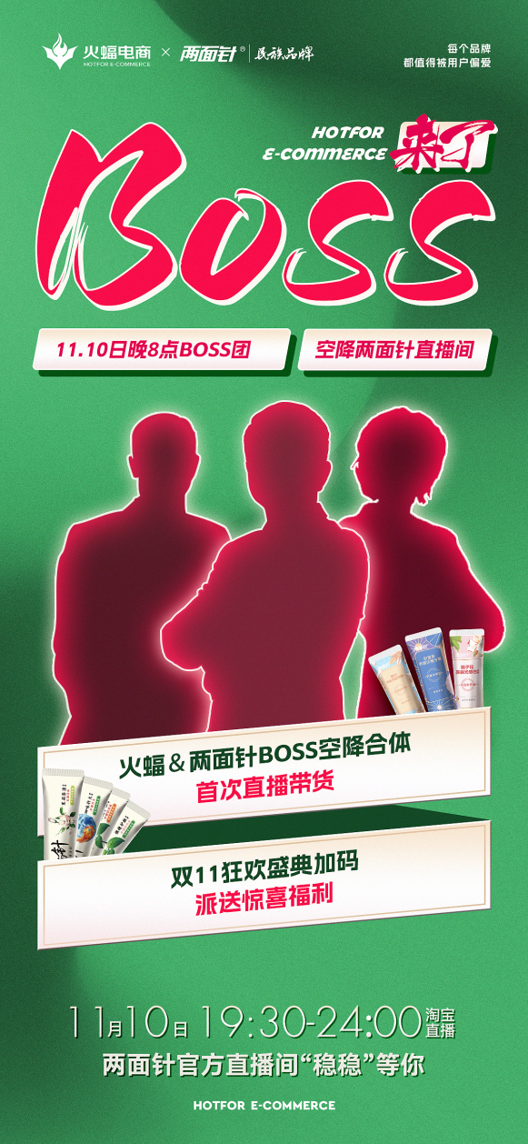 在直播峰會告一段落之后,火蝠電商雙十一活動繼續(xù)。11月10日20:30,火蝠電商BOSS將空降兩面針直播間,現(xiàn)場豪禮送不停,敬請關注!